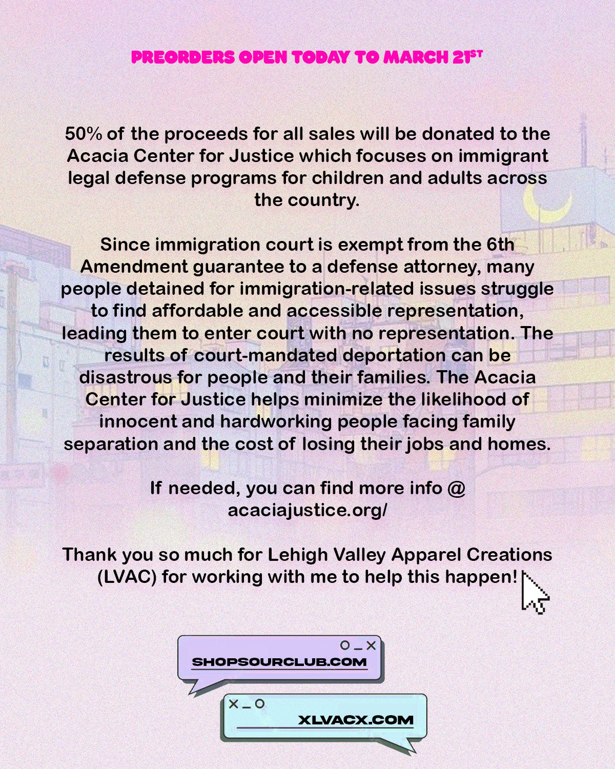 50% of the proceeds for all sales will be donated to the Acacia Center for Justice which focuses on immigrant legal defense programs for children and adults across the country. Since immigration court is exempt from the 6th Amendment guarantee to a defense attorney, many people detained for immigration-related issues struggle to find affordable and accessible representation, leading them to enter court with no representation. The results of court-mandated deportation can be disastrous for people and their families. The Acacia Center for Justice helps minimize the likelihood of innocent and hardworking people facing family separation and the cost of losing their jobs and homes.